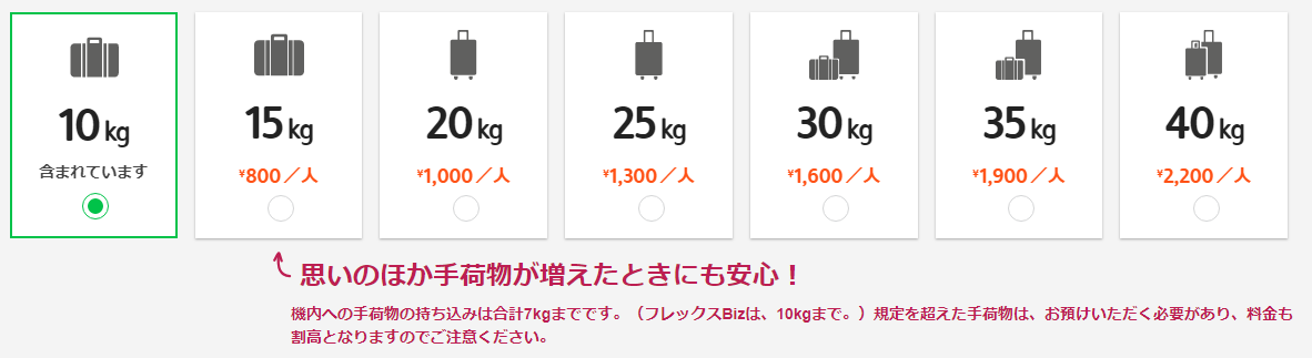 いつも使っているオプションの「ちゃっかりPlus」は10kgまでの受託手荷物が無料なので、最初からこのオプションつけるの有だと思います。