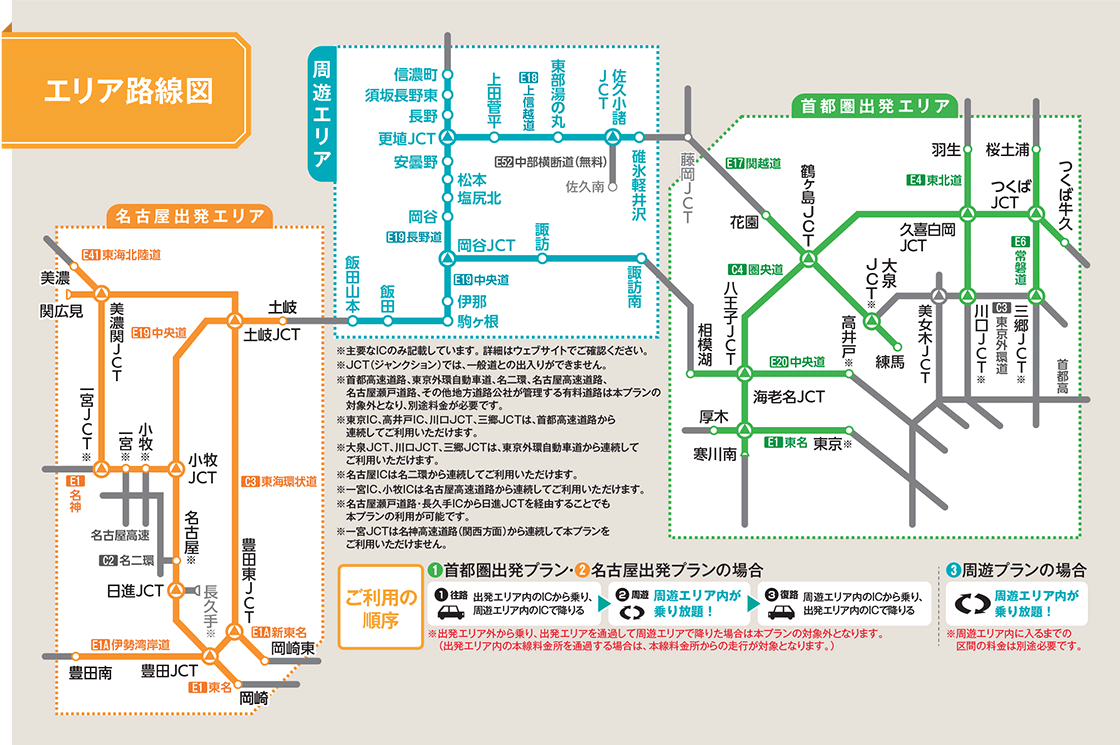 各プランとも出発・到着の際にそれぞれの「エリア」内IC利用が必須条件なのだということです。